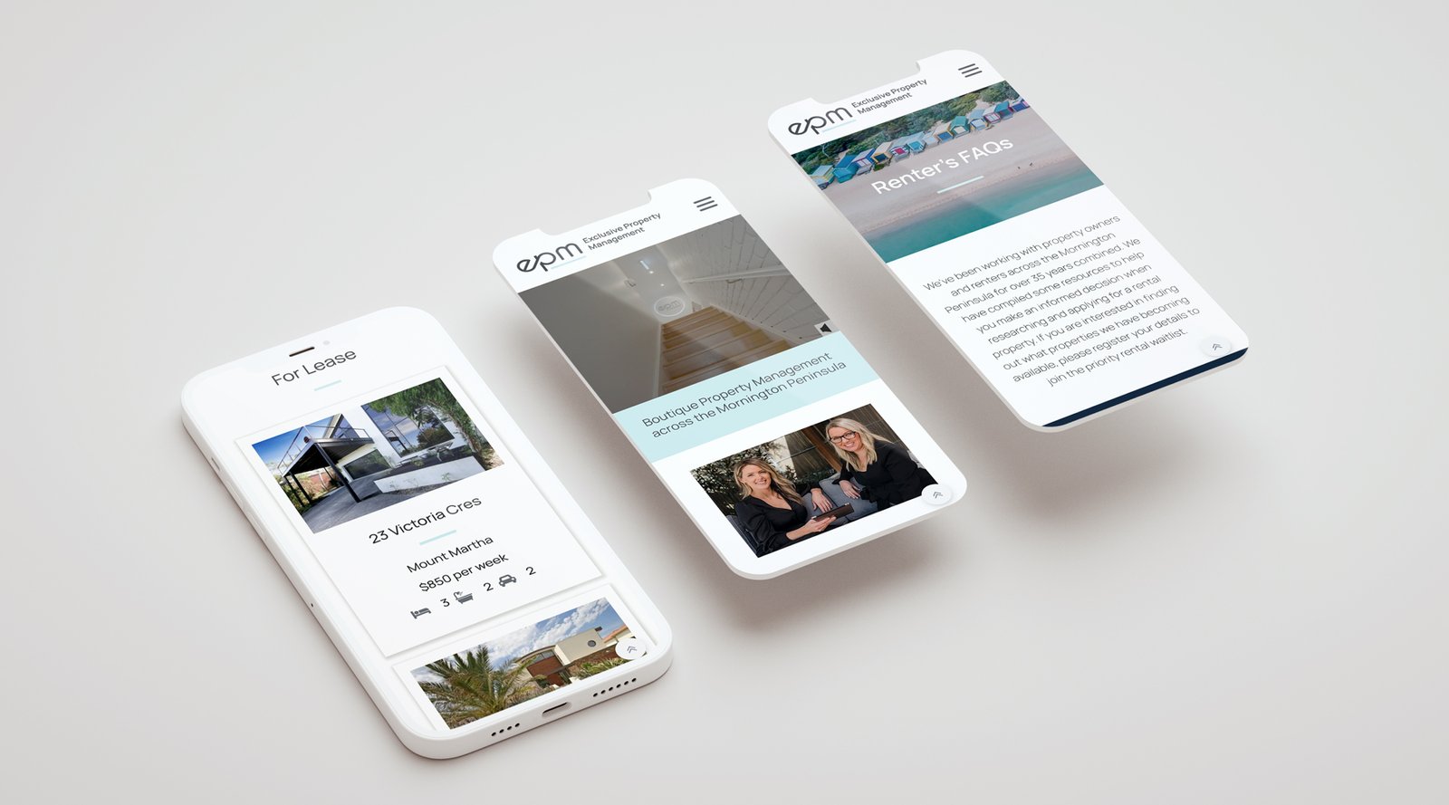 Exclusive Property Management (EPM) specialise in leasing and managing luxury homes and holiday rentals on the Mornington Peninsula. The goal was to formalise their branding elements and elevate their presence. The project required a new website to showcase their capabilities and property portfolio.